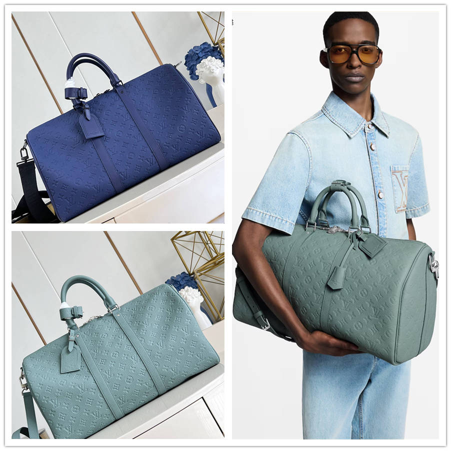 BCFK【独家实拍 M11495蓝 】本款 Keepall Bandoulière 50 手袋为 Monogram 压纹 Taurillon 牛皮革勾勒同色系饰边,与金属件和肩带碰撞色彩反差。顶部手柄和可拆卸并调节的肩带成就舒适背携体验。50 x 29 x 23 厘米 (长度 x 高 x 宽)