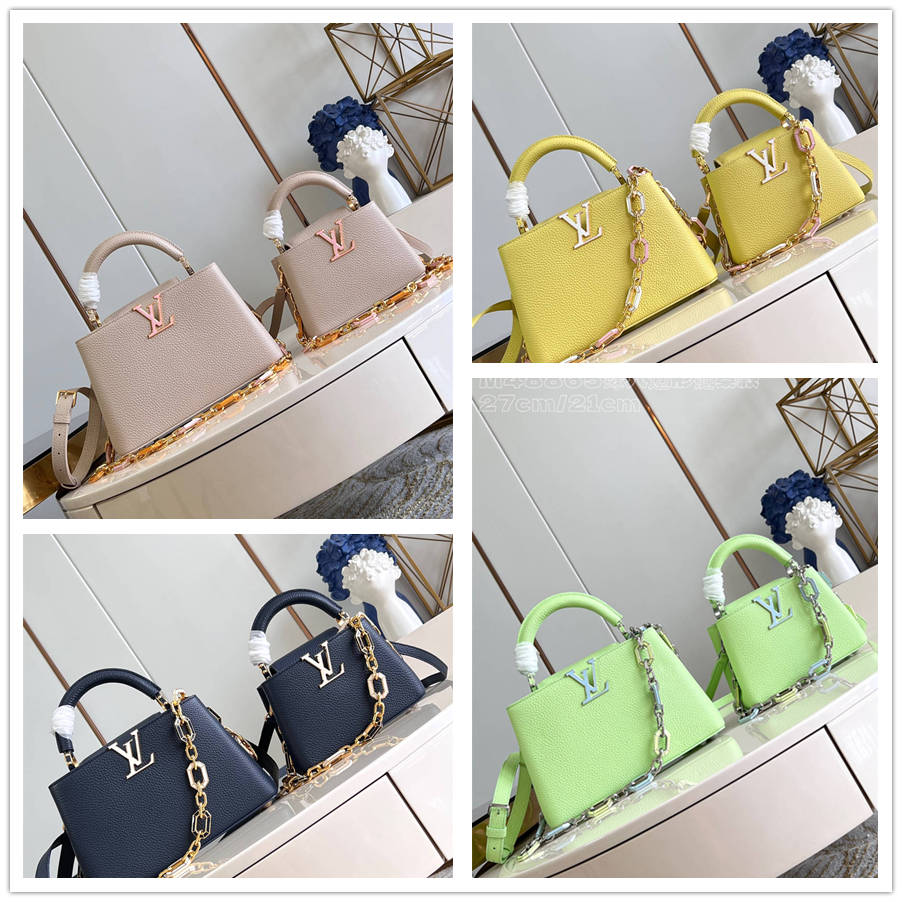 【独家实拍 M48865深蓝八边形链条款/迷你 】 本款 Capucines 迷你手袋取材明丽 Taurillon 牛皮革,为精巧链条的八边形链环镶嵌缤纷珐琅,阐明装饰艺术的设计理念。3D LV 字母再添清新笔触。BDFK BEFK