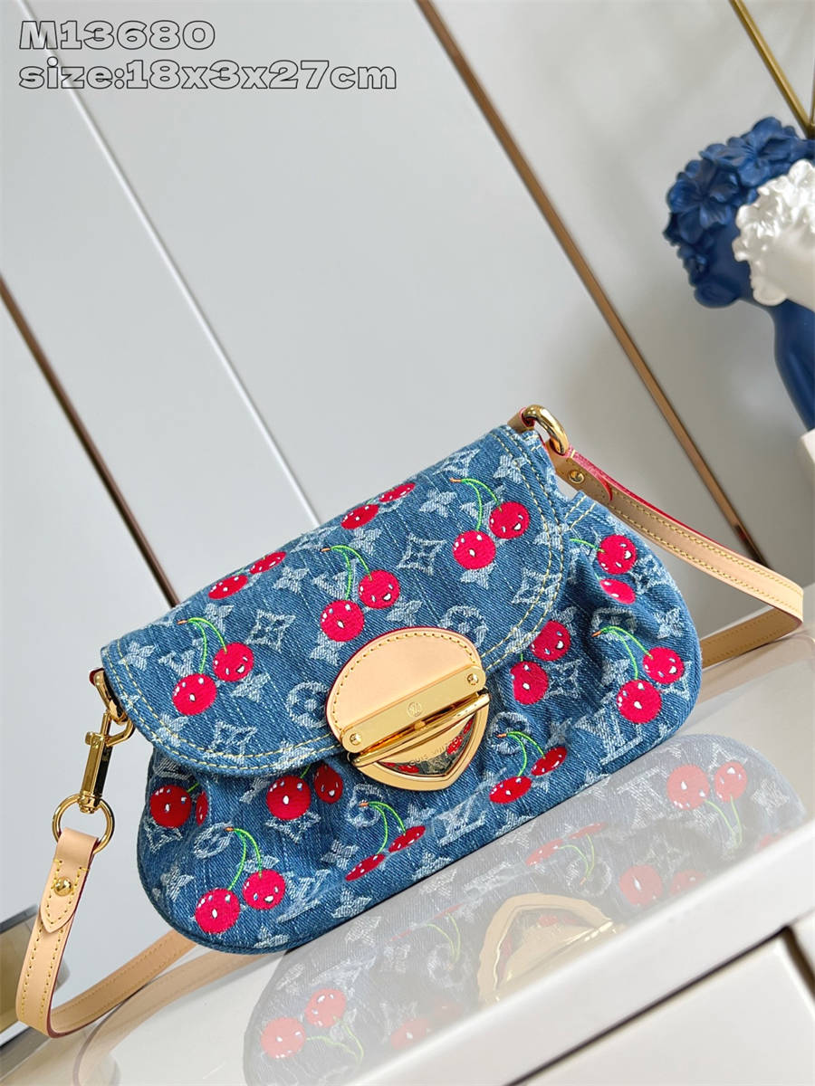 HKK【独家实拍 M13680/对版】本款 Sunset 手袋取材 Monogram 丹宁布,以复古笔触塑造圆润构型,再借醒目插扣点亮设计。明丽樱桃刺绣彰显路易威登 x 村上隆刻系列的灵动格调,饰钉皮革肩带完善整体。18 x 3 x 27 厘米 (高 x 宽 x 长度)