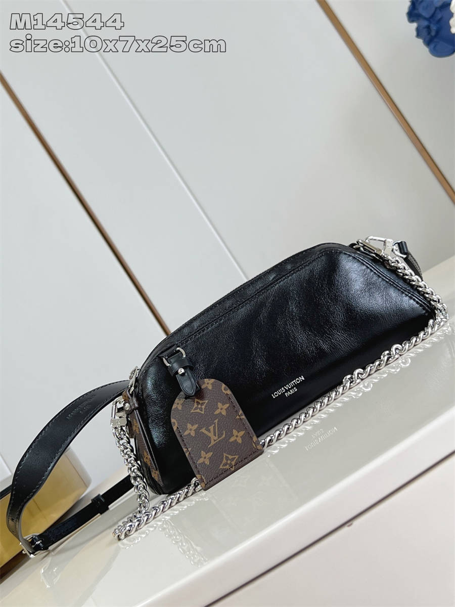 GKK【独家实拍 M14544 】本款 Pochette Vibe 手袋出自 LV Vibe 系列,为亮泽柔软羊皮革包身搭配瞩目链带。Monogram 地址牌与 LV Circle 标识彰显品牌格调。双面肩带焕新 Carryall LV Vibe 手袋原版设计,提供多样背携选择。10 x 7.5 x 25 厘米 (高 x 宽 x 长度)