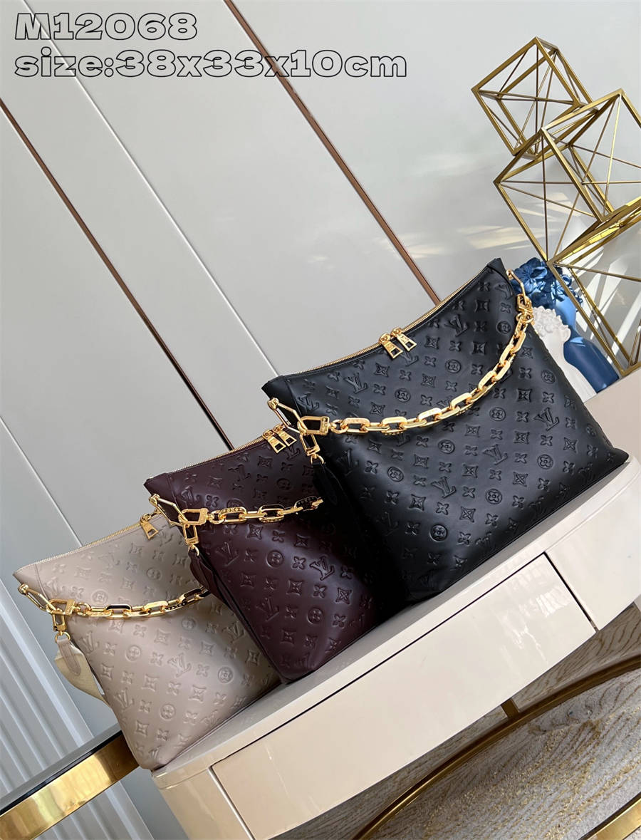 BKFK【独家实拍 M12068黑 】這款全新Coussin Hobo MM的流浪包兼具時尚與功能,並糅合了系列標誌性的設計元素。手袋採用滑面的鋪棉皮革製造,並綴以品牌的Monogram壓花圖案。標誌性的粗鏈帶搭配金色金屬件,而可拆式紡織寬肩帶則可作不同的方式攜帶。這個百搭款式足以容納手提電腦,並設有可拆式拉鏈口袋。38 x 33 x 10 厘米 (長度 x 高度 x 闊度)