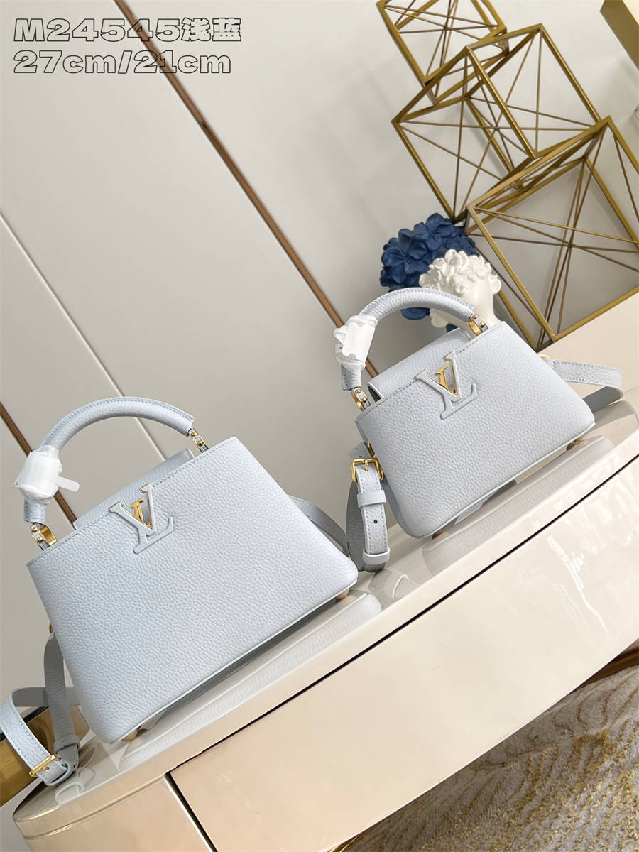 【独家实拍 M24545浅蓝/迷你 】本款 Capucines 迷你手袋取材细腻 Taurillon 牛皮革,以莹亮手柄环和标志性 LV 字母点亮袖珍构型。巧用可拆卸肩带,肩背斜挎自如转换。BBFK BCFK