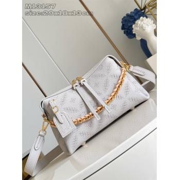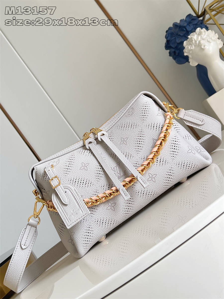 JFK【独家实拍 M13157灰 】本款 Hand It All 小号手袋选用牛皮革演绎品牌 Bloom 元素,为穿孔 Monogram 图案融入花卉意象,再借撞色名牌升级经典格调。内贴袋方便收纳手机,编织链条实现斜挎或肩背的灵活切换。18 x 13 x 29 厘米 (高 x 宽 x 长度)