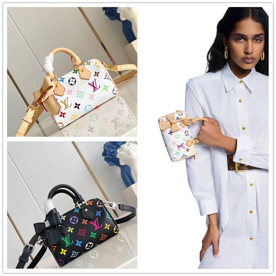 GDK【独家实拍 M13391白彩 】本款 Nano Speedy 手袋选用 Monogram 涂层帆布和牛皮革饰边塑造玲珑构型,以明丽色彩演绎路易威登 x 村上隆再版系列的灵动格调。Toron 手柄和耀目挂锁致敬品牌旅行传承,可拆卸并调节的肩带和别致 LV x TM 钥匙包完善整体。10 x 7.5 x 16 厘米 (高 x 宽 x 长度)