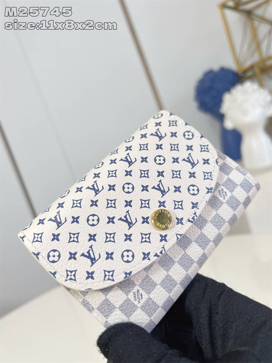 CCK【独家实拍 M25745 】這款Rosalie零錢包於LV Romance系列中重新演繹,並配上今季柔美的色調。典雅的全新版本以小牛皮搭配牛皮製造,巧妙運用品牌的Damier Azur圖案及Monogram圖案締造玩味對比。尺寸小巧玲瓏,設有多個存放貴重物品的口袋,另有兩個名片夾層。11 x 8 x 2.5 厘米 (長度 x 高度 x 闊度) \