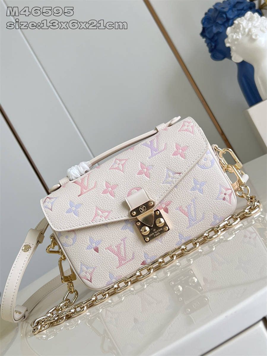 IHK【独家实拍 M46595彩色渐变 】M25682 本款 Pochette Métis East West 手袋取材粒面牛皮革,再以数码印花工艺为经典 Monogram 图案渲染渐变水彩色调,巧妙点明 Dream 系列的梦幻主题。金属件与 S-lock 锁扣闪烁莹润光泽,拉链外袋和多重内袋可容纳昼夜场合所需。13.5 x 6 x 21.5 厘米 (高 x 宽 x 长度)