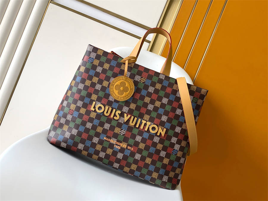 FIK N00192 顶级原单 动态163 Shopper Tote 手袋的设计灵感源自路易威登经典购物袋,以同样利落的线条和对比鲜明的路易威登字母标识为特点。此款手袋选用 LVers Damier Ebene 涂层帆布,搭配 Pharrell Williams 以多彩手法重新演绎的 Damier 图案(这一灵感源自 1888 年 Georges Vuitton 创造的经典设计)。两条顶部手柄与可拆卸肩带提供了灵活的携带方式,兼具实用性与独特魅力。40.0 x 32.0 x 16.0 厘米 (长 x 高 x 宽)