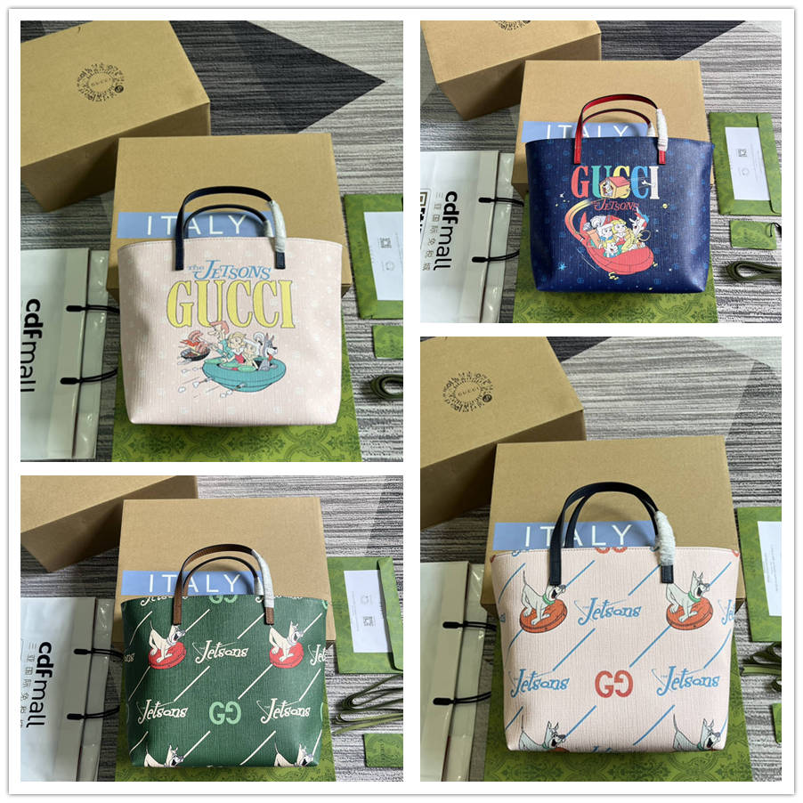 CCK(配全套包装)儿童印花购物包。《杰森一家》以2062年为背景,梦幻呈现一个充满神奇道具和异想天开的小发明的未来太空时代,演绎技术乌托邦主义世界。多款成衣及配饰单品搭配动物和机器人等印花或刺绣细节,趣致融合《杰森一家》相关角色和Gucci标识。饰GG杰森一家印花蓝色Supreme帆布,红色Supreme帆布滚边,《杰森一家》及全部相关角色和元素均为 & TM HB所有。(s23),尼龙衬里。