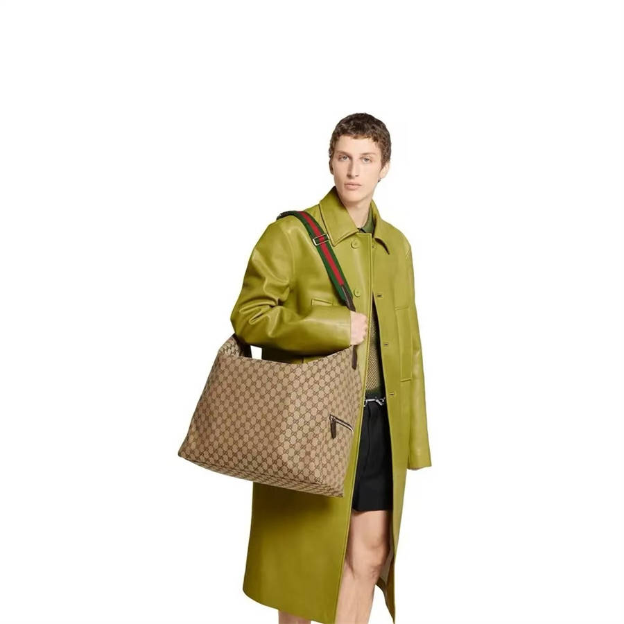 GJK【配置专柜礼品袋】GG帆布致敬品牌立等可辨的GG字母交织图案,该图案源自品牌创始人Guccio Gucci先生的姓名首字母缩写。这款日常托特包缀饰红绿织带细节,配以深棕色皮革肩带,是您理想的搭配选择