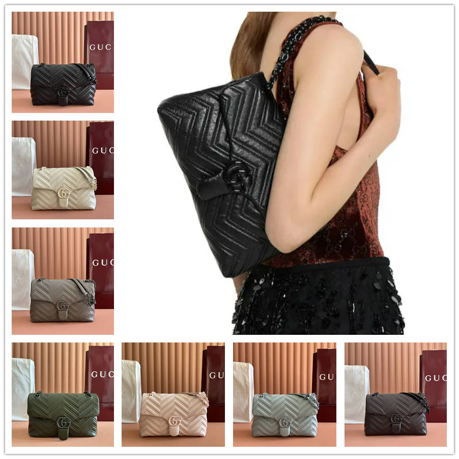 ICK【配全套原厂专柜包装】2025秋冬系列, 品牌标志性GG Marmont系列匠心融蕴经典双G元素和切面链式包带,缔就柔软不失挺括的廓形设计。这款单品采用柔软轻质绗缝V型牛皮革匠造而成,搭配同色调珐琅配件与链条。
