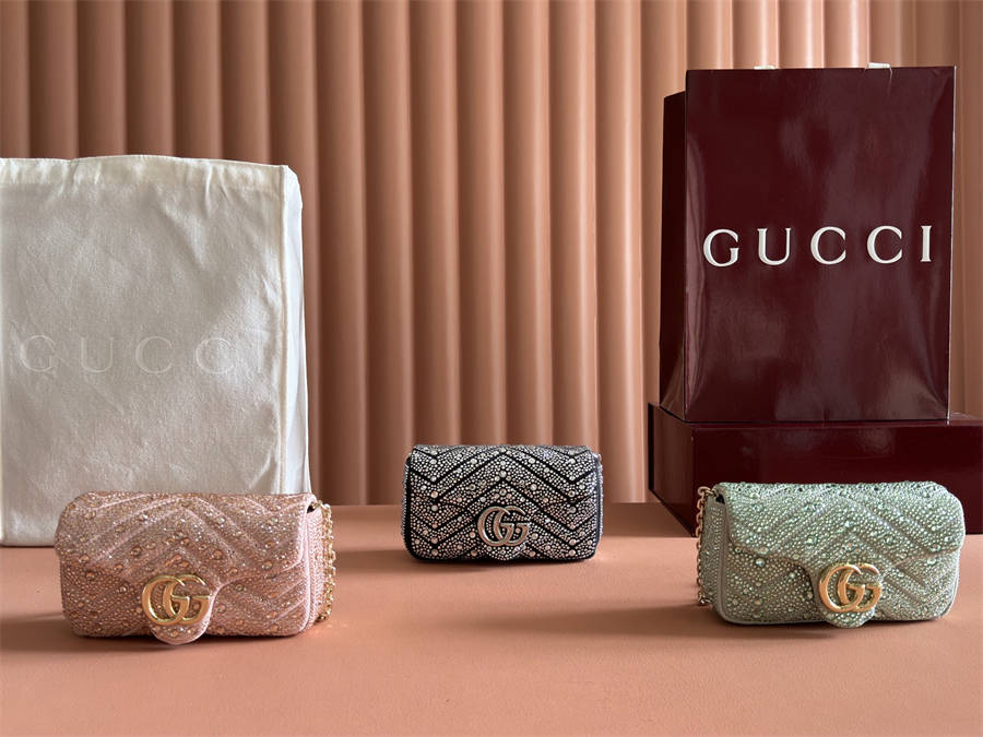 FKK【配全套原厂专柜包装】品牌标志性GG Marmont系列匠心融蕴双G造型配件和切面链式包带,甄选牛巴革缔就柔软廓形,配以夺目仿水晶,更添亮眼格调。