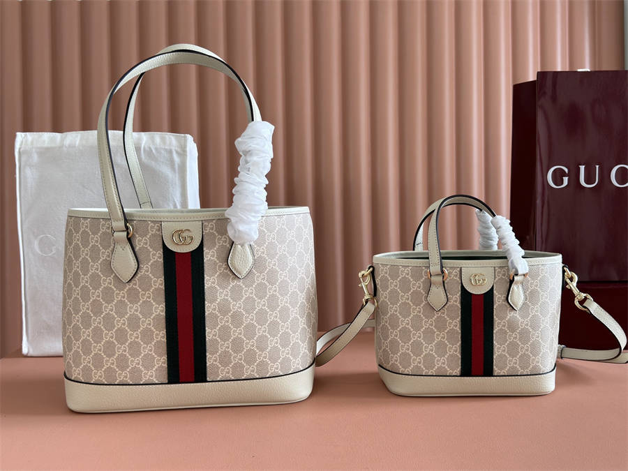 FBK FDK【配全套原厂专柜包装】Ophidia系列以标志性条纹织带与浅金色调双G元素致敬品牌传承。这款托特包以白色GG字母交织图案涂层织物匠心打造,配有顶部提手和一根肩带,采用绿色棉质衬里。