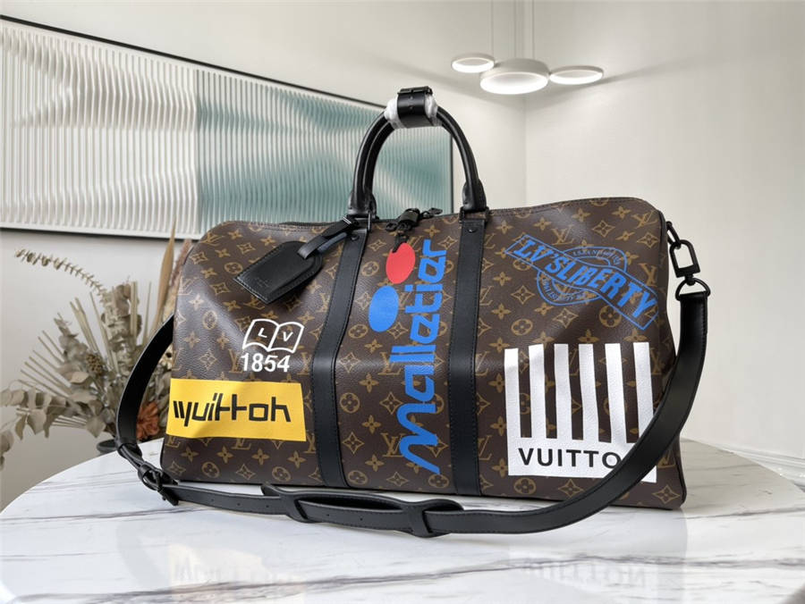 顶级原单 M44642 老花 最新专柜同步,KEEPALL 50 旅行袋(配肩带)男士时装秀中的关键面料为基础,织物手柄与饰有标识压纹的可脱卸皮革肩带。尺寸:50.0 x 29.0 x 23.0 cm
