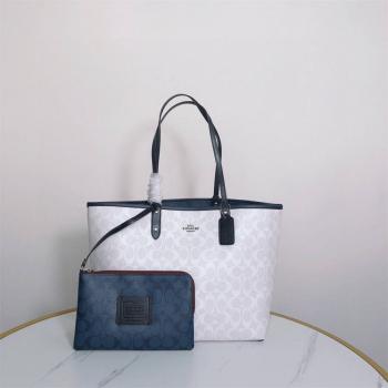 Coach 91381 蓝白双面购物袋子母托特包编号BIK专柜最新色 Coach新款 91381 双面购物子母开口托特包 双面logo花纹款自带一个大号拉链手包,可以拆卸。内里容量大 方便实用的一款 两面都非常好看 pvc面料可以对比专柜 品质一级棒 一面是浅白色,一面牛仔蓝色 都是今年大热的颜色, 双面用,超级无敌巨好看又百搭 尺寸:32*28*14.5 开口尺寸:45 cm