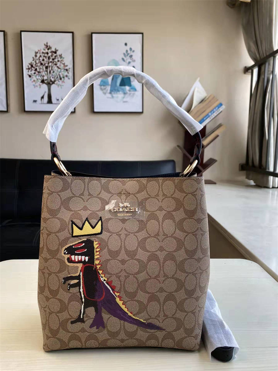 COACH X JEAN-MICHEL BASQUIAT TOWN 恐龙中号水桶包C5787编号CIK新款C5787 与Basquiat联名款,最新款,恐龙涂鸦水桶包中号,恐龙皇冠,卡通涂鸦。搭配肩带及手腕带,能满足各种出行搭配需求。经典老花料包身,配头层牛皮底围及肩带,同样使用头层牛皮电压蛇纹手腕带,好看的配色,秋冬百搭色。尺寸:24*26.5*12。