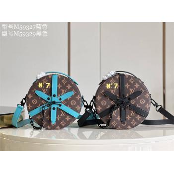 IDK【独家实拍M59327蓝色】M59706 Wheel Box 手袋拥有标志性圆润构型和皮革饰带,与 1905 年为豪华轿车设计的路易威登 Chauffeur 帽盒一脉相承,以当代格调携带日常所需。经典 Monogram 帆布烘托 N°7 标识,纪念 Virgil Abloh 于 2022 春夏季推出的第七个路易威登系列。尺寸:23 x 23 x 8 cm