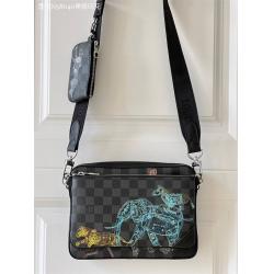GFK【独家实拍58040黑格印花】 Trio 邮差包 于 Damier Graphite 帆布表面描绘野生动物群像,近观可见其由恰似护照印章的图案组成。拉链主隔层、可拆卸小号手拿包和固定于可调节肩带的零钱包实现三合一功能。M69443 尺寸:25 x 18.5 x 7 cm