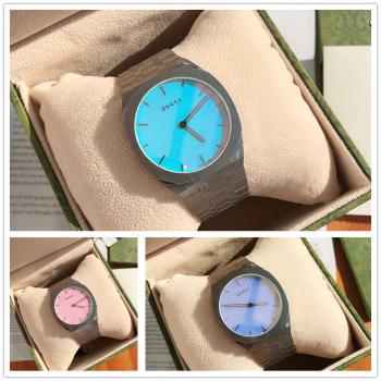 JKK GUCCI 古驰25H系列腕表,开启这场名为“多彩游戏”的角逐实力抢占时尚C位。这款腕表用玻璃的色彩取代传统表盘,根据光线的照射让其呈现不同的色彩——如大海的蓝绿色调、可爱的浪漫粉色调,每一抹都能掀起时尚热潮。流线型设计灵感源自当代建筑的流畅造型,采用轻薄的18K黄色镀金多层表壳和五链节精钢表链,搭配品牌字母交织图案标识。GUCCI 25H的名字源于对创作总监亚力山卓·米开理来说具有意义的幸运数字。表盘38毫米,超薄表壳(6毫米)宛如第二层肌肤,舒适感极佳。适合男士女士休闲商务都很适合的一款腕表饰互扣式双G图案金色调黄铜表盘,五链节精钢表链,瑞士制造石英机芯,3 ATM(30米)防水,防反光涂层蓝宝石玻璃(玻璃跟着不同角度会变色哦)全部配件来源于金*丰原厂,后配包装盒。