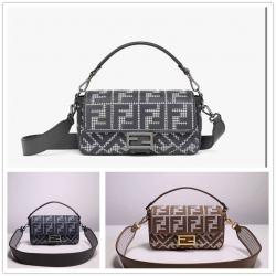 FD芬迪FEND1 Iconic Baguette中号手袋,棕色千鸟格纹羊毛材质,饰有FF刺绣