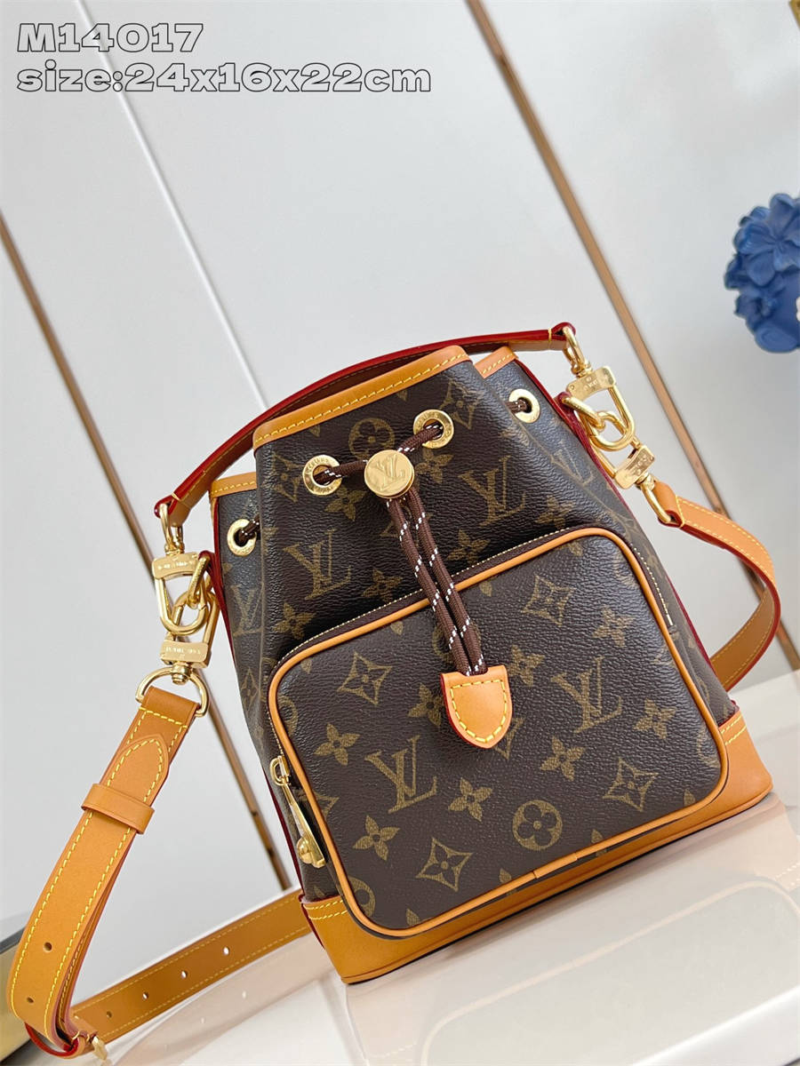 HFK【独家实拍 M14017老花 】路易威登 Noé Cargo 水桶包以 Monogram 帆布构型,配以做旧感皮革饰边,传承了 1932 年为携带香槟酒瓶而设计的 Noé 水桶包。宽大前袋和精琢细节致意了路易威登的悠久历史,同时满足现代需求。顶部手柄和肩带均可拆卸,实现灵活便携。24 x 16 x 22 厘米 (高 x 宽 x 长度)