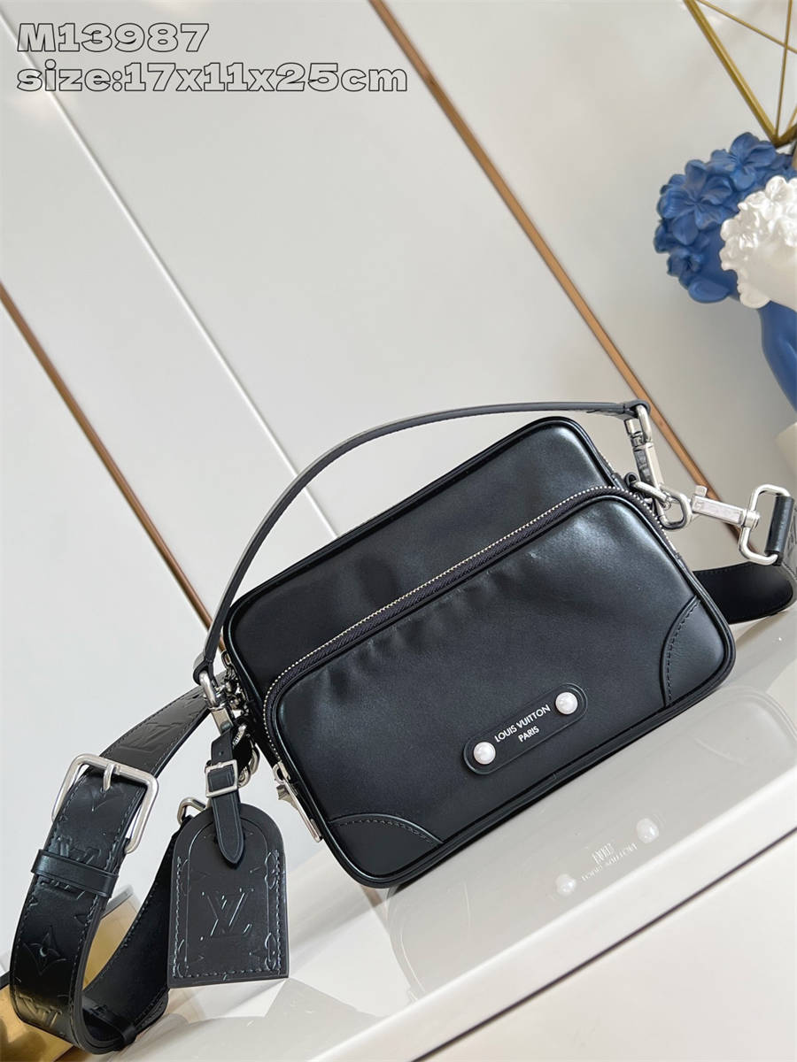 IKK【独家实拍 M13987 】本款 Nil 手袋闪耀牛皮革的优雅莹泽,再借珠饰铆钉将路易威登巴黎贴饰固定于正面。侧面锁扣彰显都市型格,主隔层拉链头点缀 LV 字母装饰。17.5 x 11 x 25 厘米 (高 x 宽 x 长度)