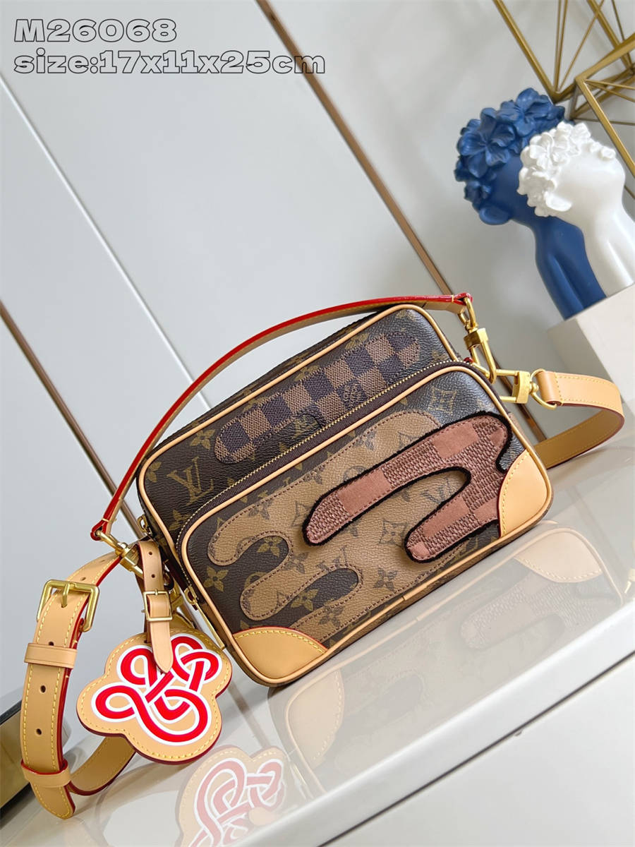 HKK【独家实拍 M26068 】本款 Nil 斜挎包为 Monogram 帆布包身融入 Damier 和 Monogram Reverse 帆布贴饰,营造雅致拼贴画效果。宽敞主隔层和拉链前袋确保便捷取放,可拆卸顶部手柄和肩带实现多种背携方式。17.5 x 11 x 25 厘米 (高 x 宽 x 长度)