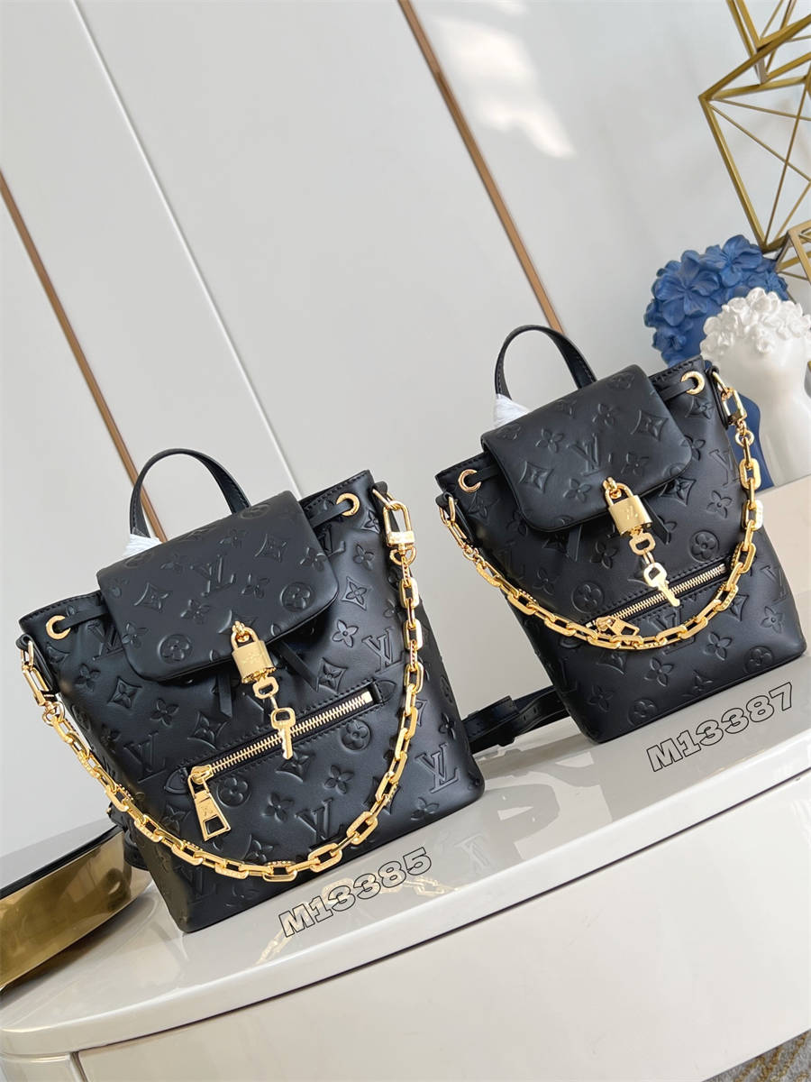 【独家实拍 M13387黑 】 Coussin Backpack 迷你手袋以 Monogram 皮革塑造轻便构型,搭配可拆卸 Coussin 链条。工致金属 LV 挂锁确保日常所需安全无虞,双肩背、单肩背或手提皆宜。JKK BKKK