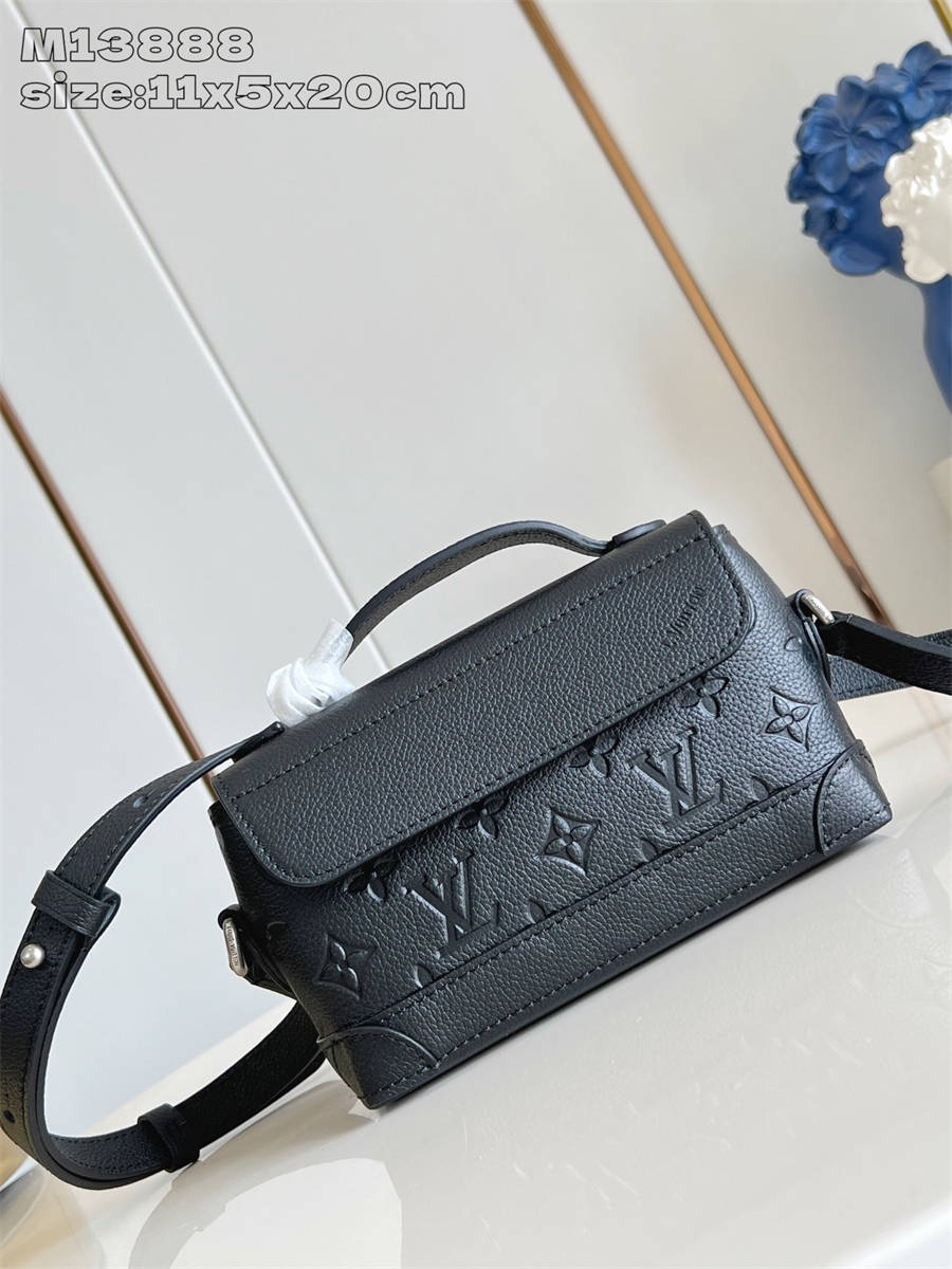 GIK【独家实拍 M13888黑 】本款 Steamer East West 迷你手袋以 Monogram 压纹 Taurillon 牛皮革演绎横向构型,彰显 Steamer 系列的经典设计。翻盖开合、别致加固包角和顶部手柄构筑考究细节。搭配可调节肩带,实现斜挎手提随心切换。11 x 5 x 20 厘米 (高 x 宽 x 长度)