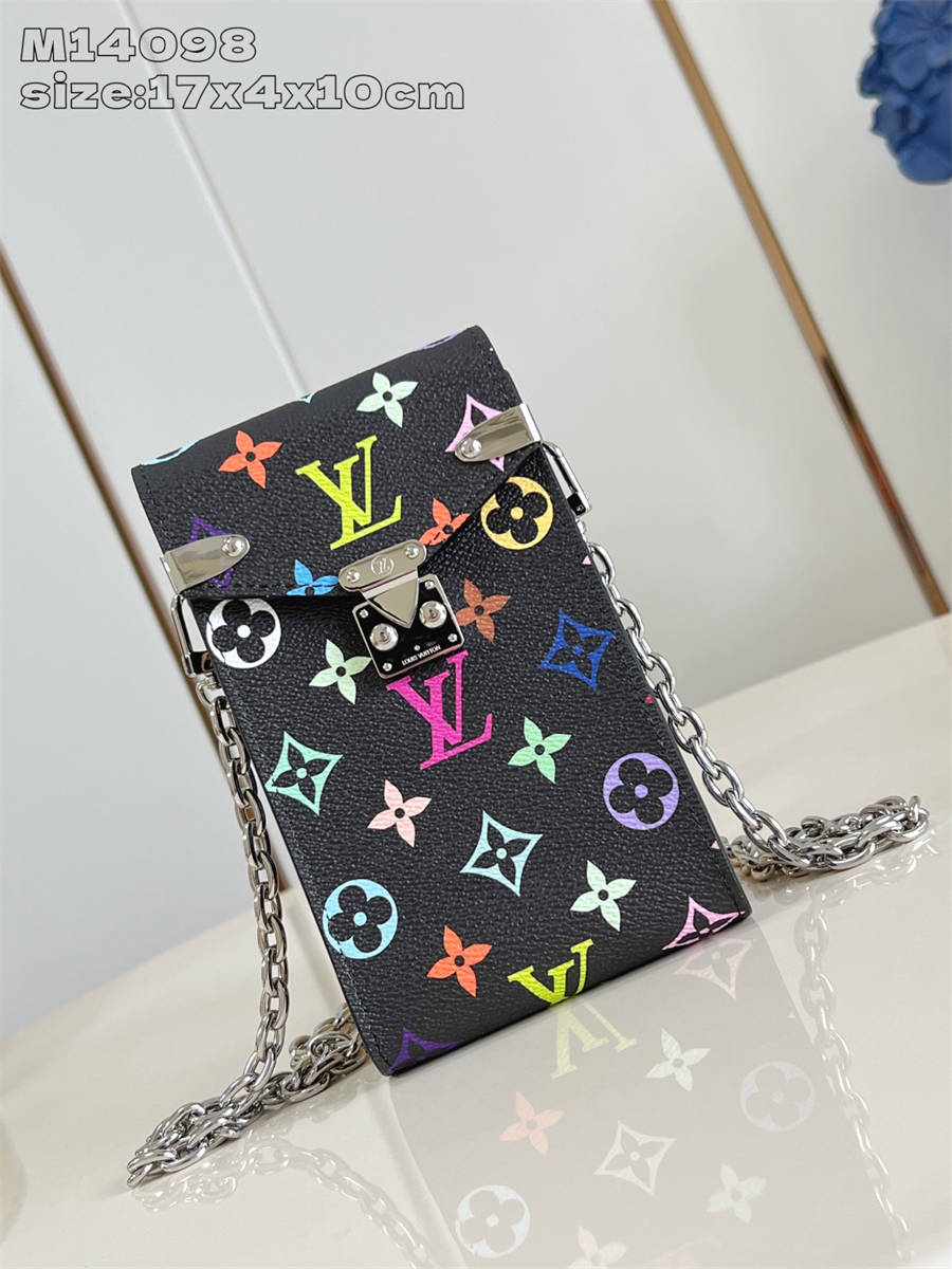 FDK【独家实拍 M14098黑彩】村上隆合作系列 本款 Métis 手机包向路易威登经典行李箱采撷灵感,以整片 Monogram 帆布裁出工致构型。S-lock 锁扣和金属包角娓娓道出品牌悠久的制箱传统。系上可拆卸链条,瞬间解放双手。17.5 x 4 x 10.4 厘米 (高 x 宽 x 长度)