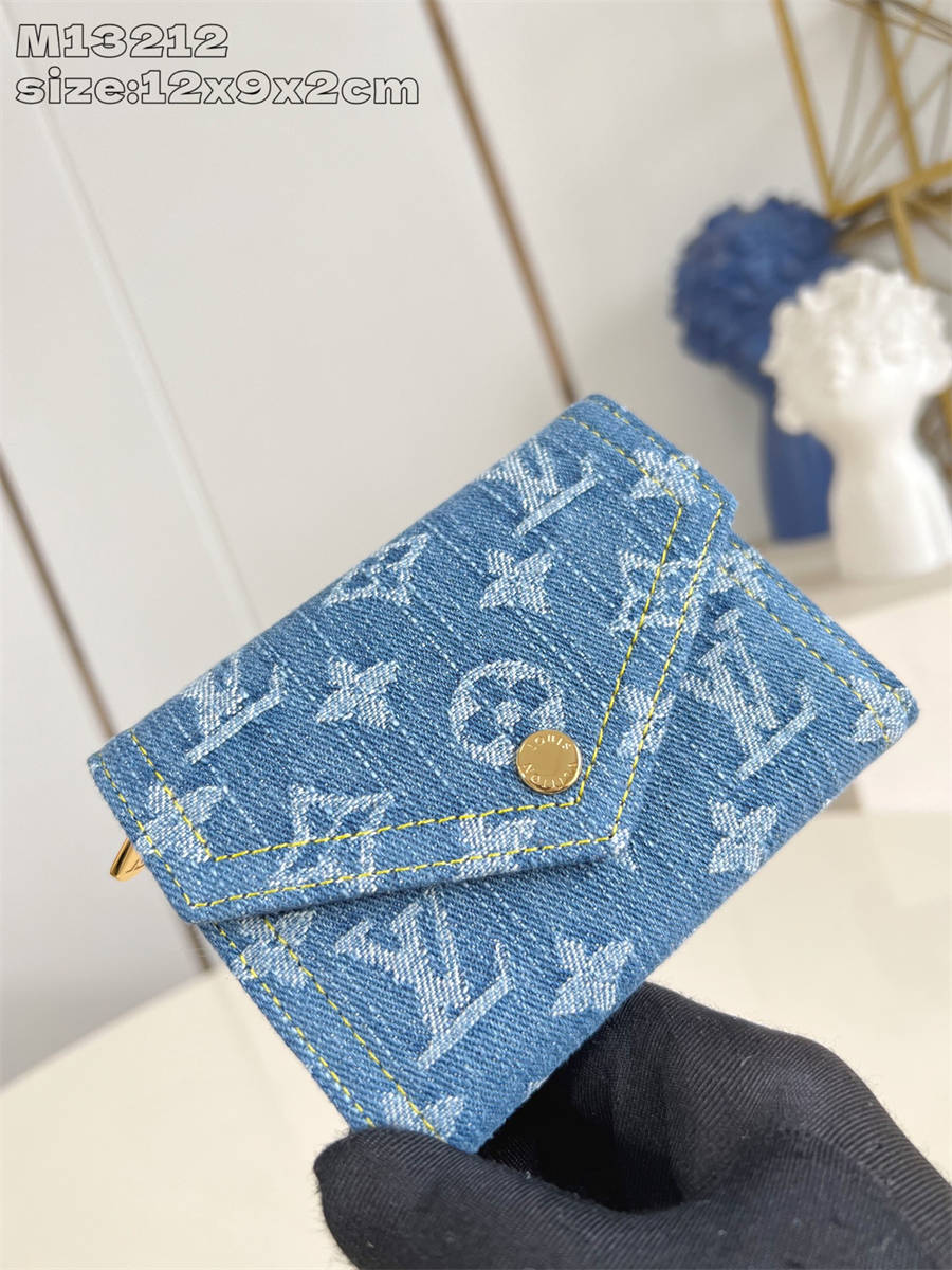 CEK【独家实拍 M13212 】今季這款Monogram Denim系列的Victorine錢包以活潑的藍色設計,並採用有機棉質面料製作,內層配有皮革襯裡,並設有多個口袋及夾層,可妥善存放名片、紙幣及零錢,搭配金色按扣,更顯精緻。12 x 9.5 x 2.5 厘米 (長度 x 高度 x 闊度)