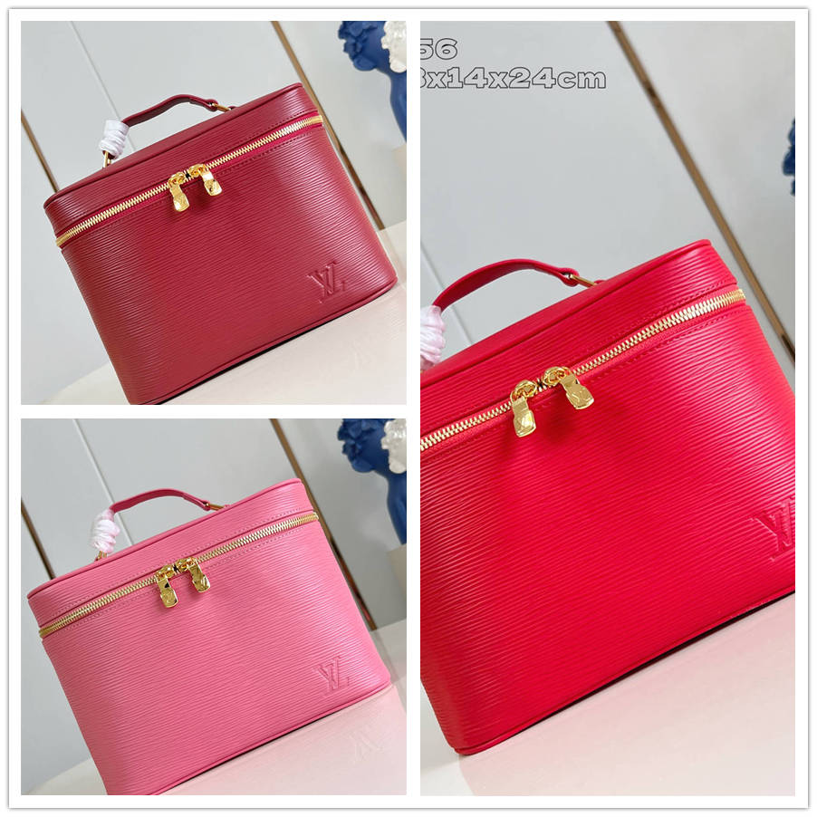 FFK【独家实拍 M25856紫红 】本款 Nice BB化妆包撷取路易威登美妆系列的唇膏色彩,以 Epi 粒面皮革塑造柔软构型,再借平放的皮革手柄释放收纳空间。巧用 LV 铭纹拉链头开启顶部的双拉链广口翻盖,即现可水洗织物内衬。恰宜尺寸方便置入旅行袋。18 x 14.5 x 24 厘米 (高 x 宽 x 长度)