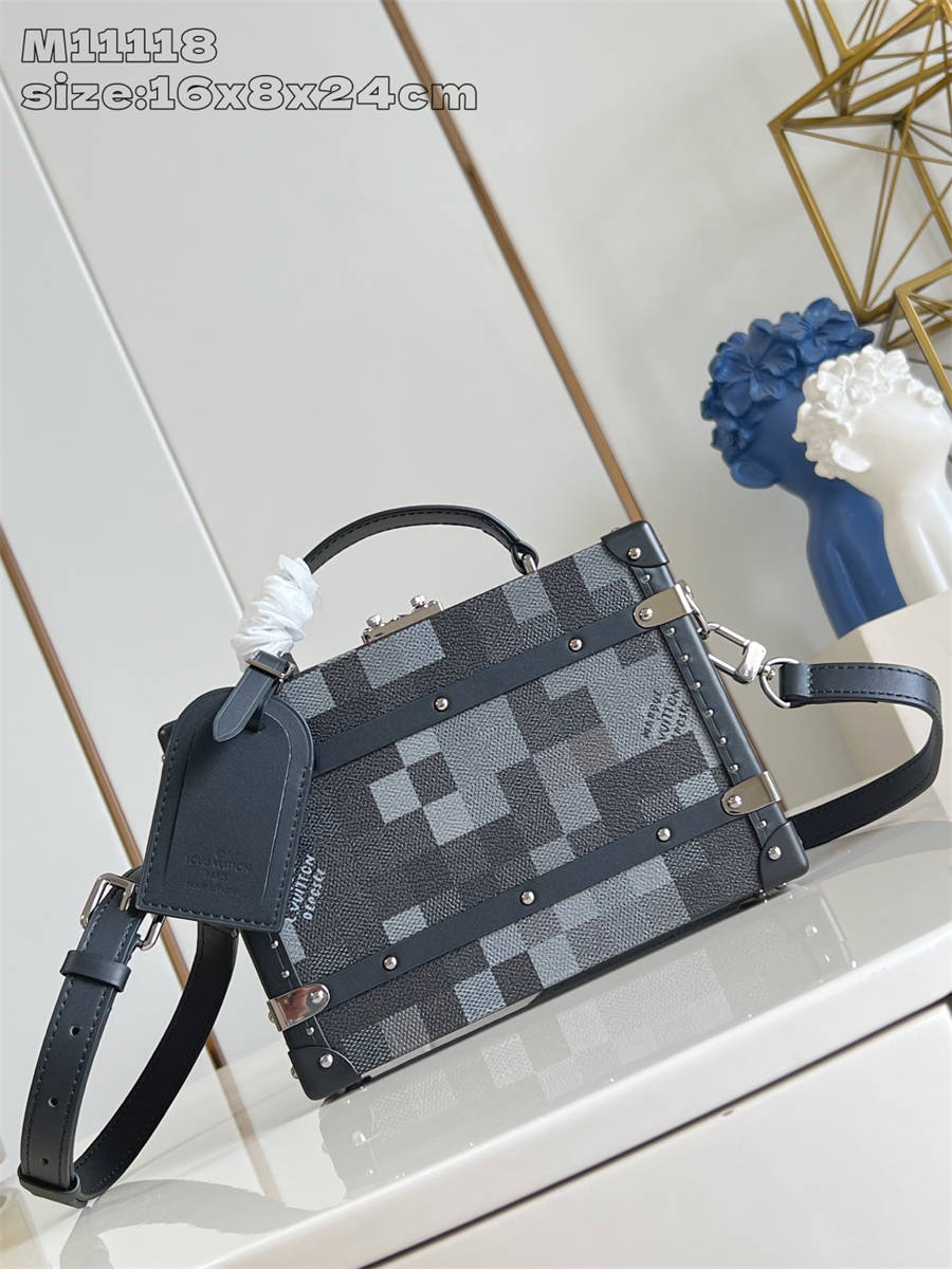 BKKK【独家实拍 M11118黑格 】N00059 本款 Handle Trunk 手袋取材 Damoflage Black 帆布,生动再现 Pharrell Williams 笔下的像素风格 Damier 图案。紧凑构型融入单色设计,于考究之中释放酷感活力。顶部手柄与可拆卸并调节的皮革肩带实现灵活背携。16.5 x 8 x 24 厘米 (高 x 宽 x 长度)