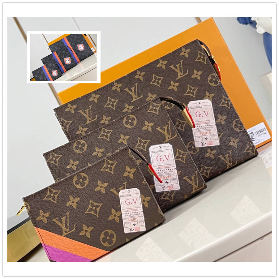 FKK【独家实拍 P01952老花 】本款 Trio 盥洗袋出自 Mon Monogram 系列,借尺寸各异的手拿包实现有序收纳,再以可洗涤内衬与广口式开合道出功能考量。可为 Monogram 帆布随心添缀缤纷条纹、专属字母及典藏风格品牌印花,打造个性风范。20 x 5.5 x 25 厘米 (高 x 宽 x 长度)