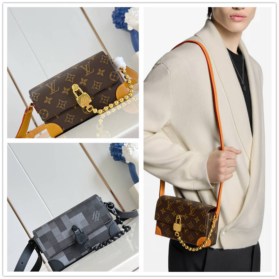 GKK【独家实拍 M14738 】本款 Steamer 迷你手袋取材 Monogram 帆布,搭配做旧牛皮革饰边和耀目金属件。崭新方形锁扣回溯 Pharrell Williams 的标志性 Damier 图案,精巧钥匙衔接工致珠链,可调节肩带实现肩背和斜挎。11 x 6.5 x 18 厘米 (高 x 宽 x 长度)