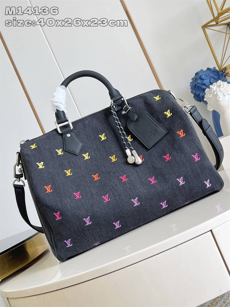 BKFK【独家实拍 M14136 】這款Speedy 40 Bandoulière以LV Blason Denim將音樂化為Pharrell Williams的時尚語言,增添精緻魅力,黑色洗水牛仔布飾以幻彩刺繡LV Initials標誌。袋款配上傳統的可拆式皮革行李吊牌,並綴以可拆式耳機吊飾。40 x 26 x 23 厘米 (長度 x 高度 x 闊度)