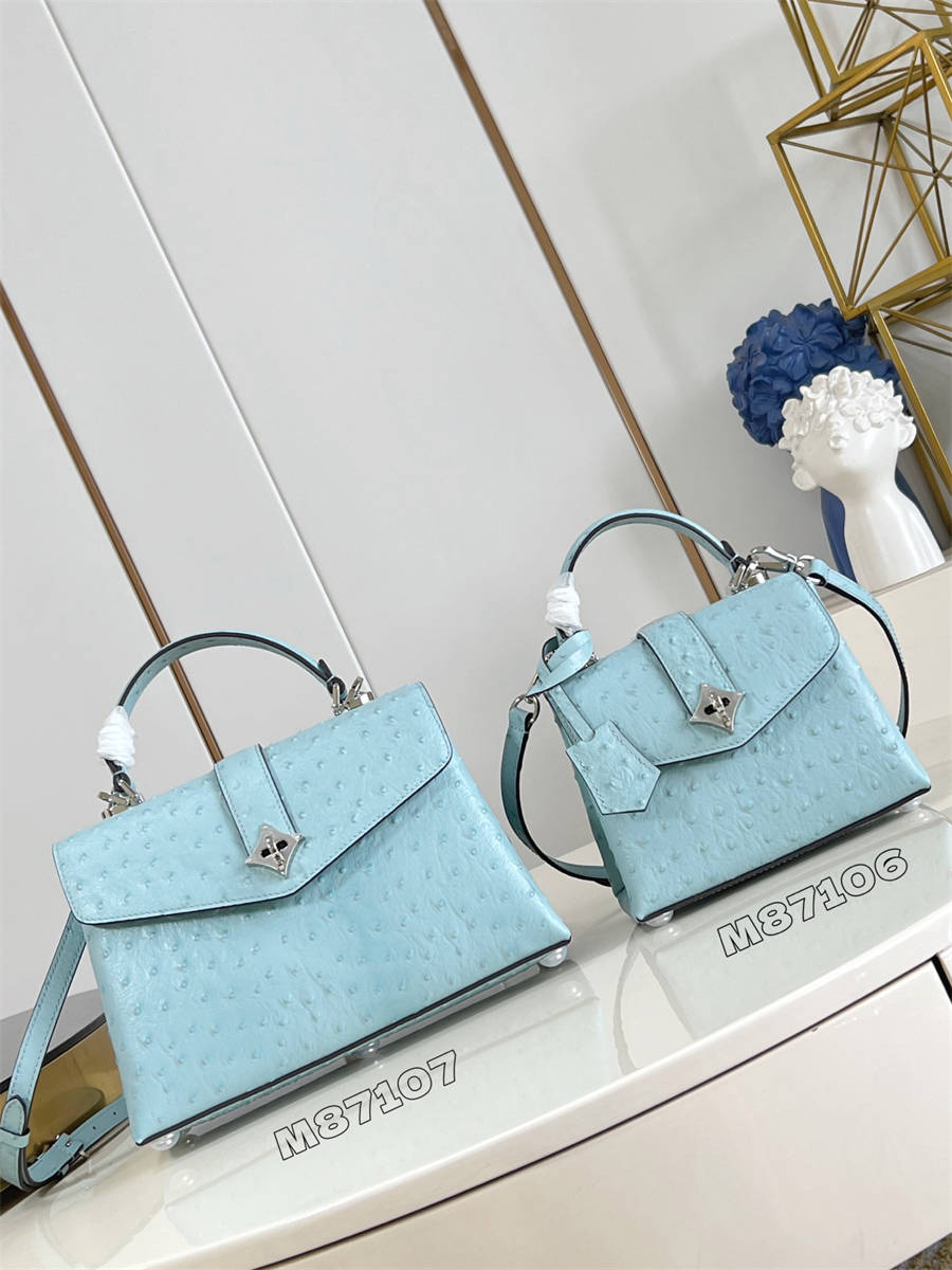 【独家实拍 M87106浅蓝哑光鸵鸟纹银芯/迷你 】Rose des Vents 迷你手袋取材光滑与粒面小牛皮勾勒雅致线条,点缀金色 LV 挂锁绽放闪耀光芒。巧用顶部手柄和可拆卸并调节的肩带,为日常出行打造优雅肘挎或实用斜挎等别样韵味。BEFK BFFK