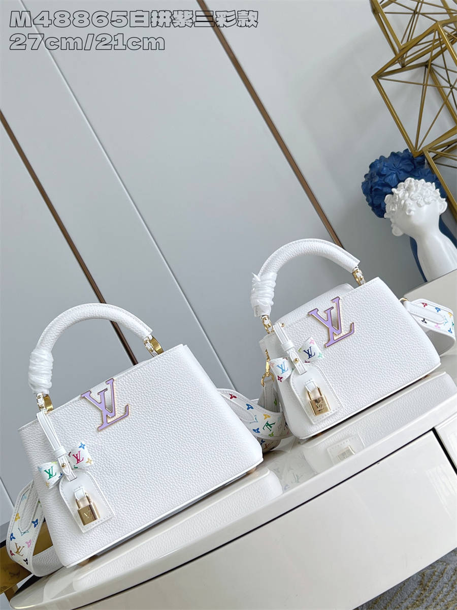 BDKK BEKK【独家实拍 M48865白拼紫三彩款/迷你 】本款 Capucines 迷你手袋出自路易威登 x 村上隆再版系列,选用 Taurillon 牛皮革妙趣演绎经典设计。LV 字母和可拆卸 Monogram 肩带浸染明丽色调,致意艺术家标志性的虹彩笔触。蝴蝶结造型钥匙包和挂锁装饰再添考究细节,内隔层和多重口袋可轻松收纳日常所需。