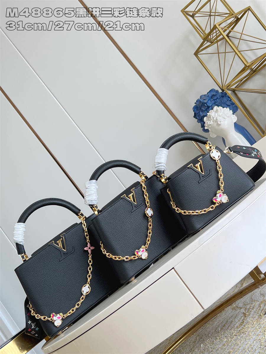 BCFK BDFK BEFK【独家实拍 M48865黑拼三彩链条款/迷你 】本款 Capucines 迷你手袋出自路易威登 x 村上隆再版系列,选用 Taurillon 牛皮革妙趣演绎经典设计。以灵动风姿彰显品牌精湛匠艺。亮泽金属件和珐琅 LV 字母为 Taurillon 牛皮革包身点亮细节,Monogram 花卉栖身可拆卸链条,明丽樱桃装饰再添新季笔触。