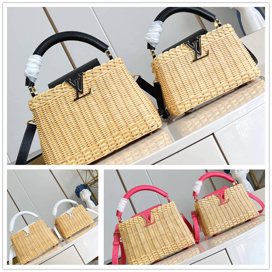【独家实拍 M48865黑印花竹篮/迷你 】M26003 本款 Capucines 迷你手袋向路易威登于 1892 年推出的 Picnic 硬箱汲取灵感,洋溢浓郁夏日风情。藤条包身需要数天的匠心编织方可完成,皮革饰边和耀目 LV 字母完善细节,斜挎、肩背或手提皆宜。BCFK BDFK