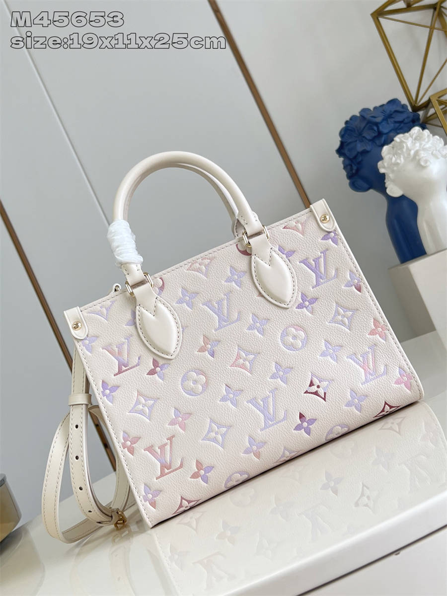 JKK【独家实拍 M45653彩色渐变 】本款 OnTheGo 小号手袋出自 Dream 系列,以典雅设计点亮各式造型。Monogram Empreinte 皮革结合数码印花工艺,巧妙呈现渐变水彩效果。耀目金属件与多重口袋丰富细节,纤长肩带方便斜挎。19 x 11.5 x 25 厘米(高 x 宽 x 长度)