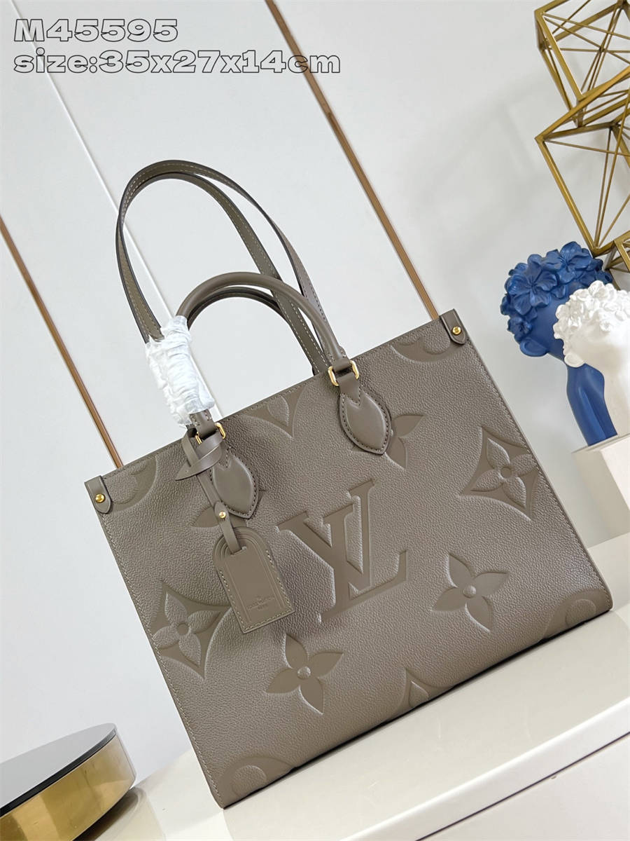 BKFK【独家实拍 M45595浅绿压花 】 本款 OnTheGo 中号手袋选用 Monogram Empreinte 皮革,以粒面纹理烘托 Monogram 压纹,为棱角分明的构型注入一抹典雅韵味。微纤维构筑的充裕内层可容纳笔记本电脑,轧制皮革手柄和长肩带实现多种背携方式。详细特征35 x 27 x 14 厘米(长度 x 高 x 宽)