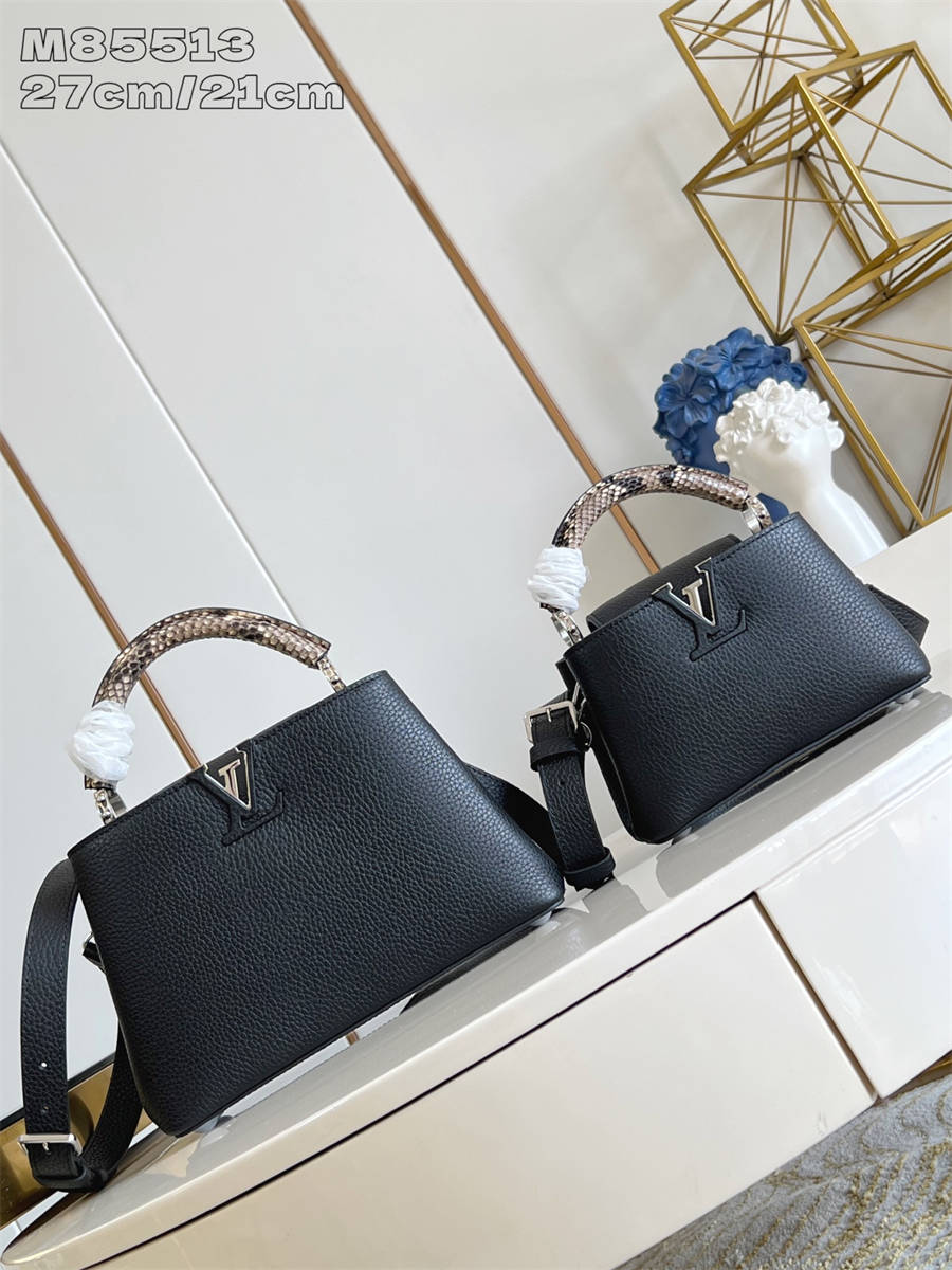 【独家实拍 M85513黑/迷你】 本款 Capucines 迷你手袋取材深染 Taurillon 皮革,以雍容蟒蛇皮革包裹手柄、翻盖和 LV 标识。无论手提或利用可拆卸宽肩带肩背,均可闪耀任意场合。BCKK BDKK
