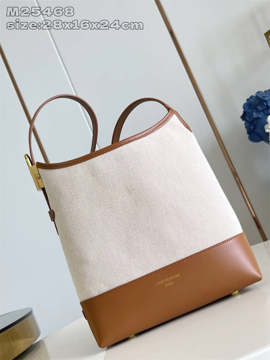 HKK【独家实拍 M25468 】本款 Low Key Hobo 小号手袋糅合帆布和牛皮革,以肌理反差演绎新季优雅格调。做旧金属件和可拆卸 Monogram 拉链内袋回溯品牌制箱传承,条纹内衬彰显考究细节。28 x 16 x 24 厘米 (高 x 宽 x 长度)