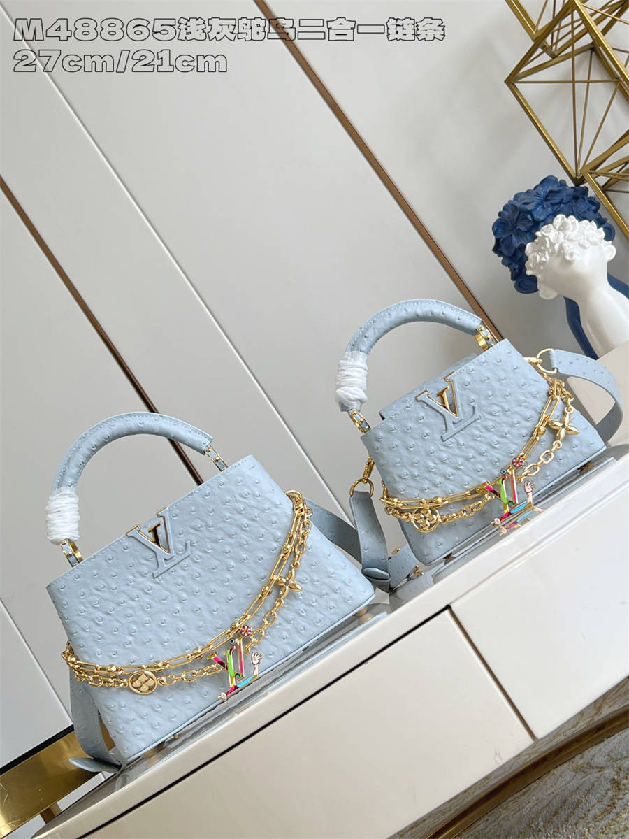 【独家实拍 M48865浅灰鸵鸟二合一链条/小号 】M12279 本款 Capucines BB 手袋出自路易威登 x 村上隆再版系列,以 Taurillon 牛皮革和耀目金属件传递典雅风范。华美链条点缀迷你挂锁和珐琅 Monogram 花卉,可外置或内收的翻盖开启多重口袋,考究设计实现多种背携体验。BDKK BEKK