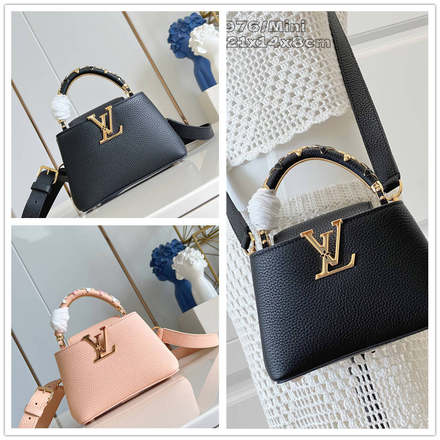BCFK【独家实拍 M14976/迷你 】這款Ivy系列的Capucines Mini綴有手繪琺瑯花卉圖案裝飾,營造浪漫風格的氛圍。包包以Taurillon皮革製造,綴有金色的LV Initials標誌向品牌的精湛工藝致敬。這款包包尺寸小巧,適合存放日常必需品,可呈現兩種風格的造型,具有間隔分明的內層,可作多種不同的攜帶方式。21 x 13.6 x 8 厘米 (長度 x 高度 x 闊度)