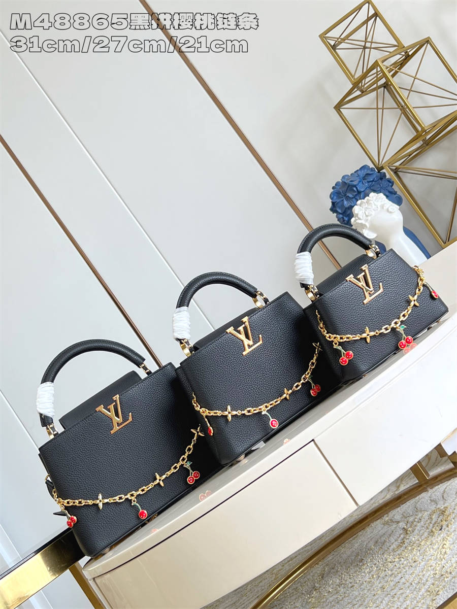 【独家实拍 M48865黑拼樱桃链条/中号 】M13741 本款 Capucines 中号手袋出自路易威登 x 村上隆刻系列,以灵动风姿彰显品牌精湛匠艺。亮泽金属件和珐琅 LV 字母为 Taurillon 牛皮革包身点亮细节,Monogram 花卉栖身可拆卸链条,明丽樱桃装饰再添新季笔触。BDKK BEKK BFKK