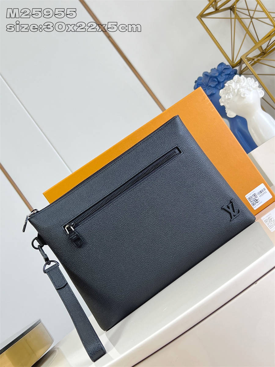 ECK【独家实拍 M25955 】這款Takeoff Pouch以蠟面小牛皮製造,配有黑色金屬件及風格一致的紡織襯裡。包包設計小巧,但容量足以放置一部平板電腦,是辦公及休閒場合的完美之選。正面護角綴有優雅的LV Initials壓花標誌,而且配有可拆式腕帶,能以不同方式攜帶。30 x 22 x 5 厘米 (長度 x 高度 x 闊度)