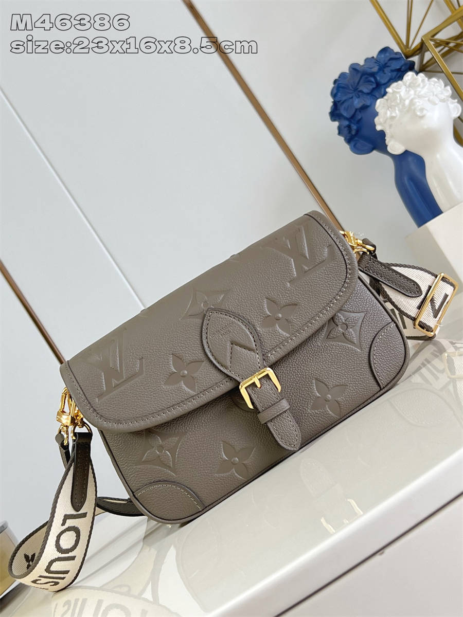 IIK【独家实拍 M46386浅绿压花 】本款 Diane 手袋为 Monogram Empreinte 压纹皮革注入典雅色调,以莹泽金属件和正面搭扣宣示从容格调。可拆卸皮革肩带实现灵活背携,路易威登标识织纹点睛可拆卸斜挎肩带。24 x 15 x 9 厘米(长度 x 高 x 宽)
