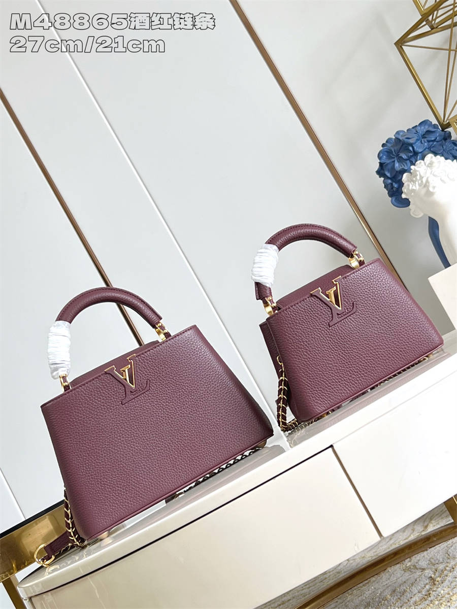 【独家实拍 M48865酒红链条/迷你 】本款 Capucines 迷你手袋取材细腻 Taurillon 牛皮革,以莹亮手柄环和标志性 LV 字母点亮袖珍构型。巧用可拆卸肩带,肩背斜挎自如转换。BCKK BDKK