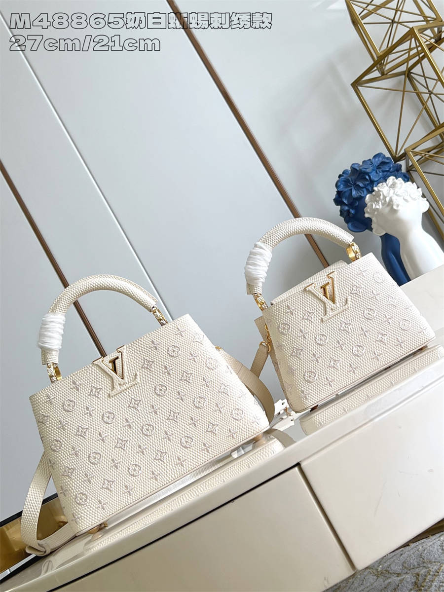 【独家实拍 M48865奶白蜥蜴刺绣款/迷你 】本款 Capucines 迷你手袋采用 Taurillon 皮革塑造玲珑构型,以蜥蜴皮革包裹翻盖、手柄和 LV 字母。翻盖可外置或内收以读取 LV 标识,可拆卸宽幅皮革肩带洋溢摩登风尚。BCFK BDFK